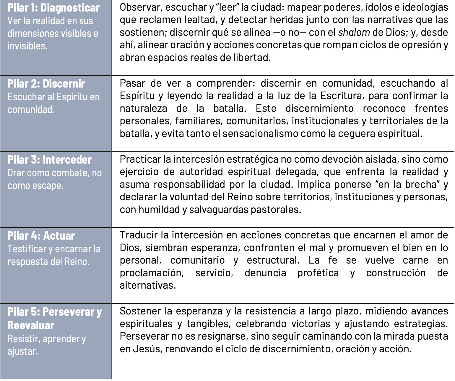 Asimismo, necesitamos afirmar ciertas convicciones que definen cómo combatimos y desde dónde lo hacemos. La guerra espiritual integral no es una técnica ni una campaña ocasional, sino un estilo de vida arraigado en la lógica del Reino. Por eso, las siguientes convicciones funcionan como cimientos y brújula. Desde ahí, podemos integrar anuncio profético, intercesión estratégica, evangelismo y discipulado integral con acción comunitaria y compromiso en la transformación de estructuras como expresiones de una misma misión del Reino.66