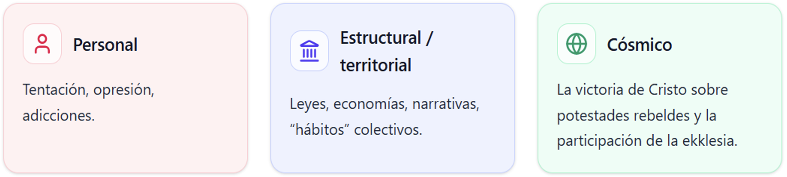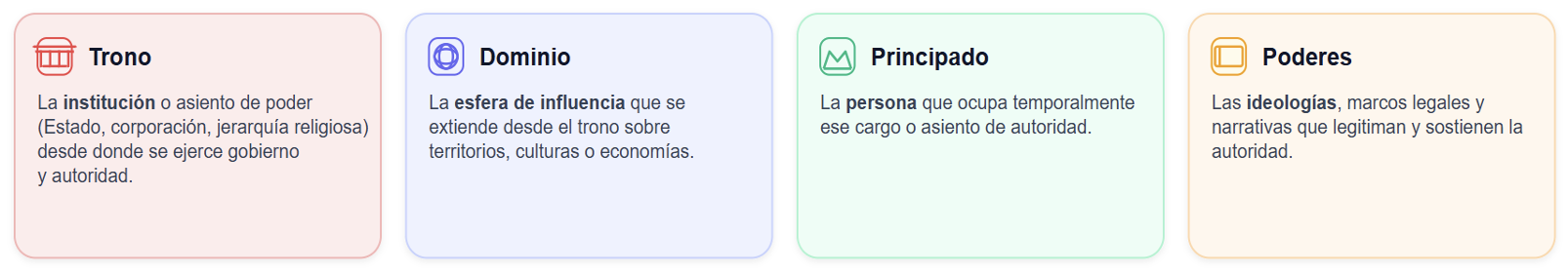 Pablo nombra esta confrontación con un lenguaje de potestades: “tronos, dominios, principados y poderes” (Col 1:16; Ef 1:21); son realidades espirituales que se expresan en instituciones concretas: El trono es la institución o asiento de poder (Estado, corporación, jerarquía religiosa); el dominio es la esfera de influencia que se extiende desde allí sobre territorios, culturas o economías; el principado es la persona que ocupa temporalmente ese cargo; y los poderes son las ideologías, marcos legales y narrativas que legitiman y sostienen la autoridad (véase glosario).